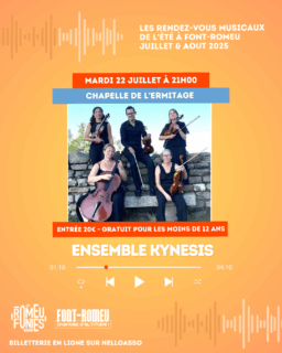 Entrée 20€. Gratuit pour les moins de 12 ans. Billetterie sur place ou en ligne : https://www.helloasso.com/associations/office-de-la-culture-et-du-patrimoine-de-font-romeu-odeillo-via/evenements/quatuor-ensemble-kynesis