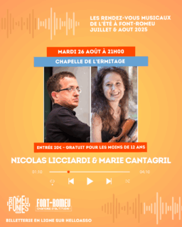 Entrée 20€. Gratuit pour les moins de 12 ans. Billetterie sur place ou en ligne : https://www.helloasso.com/associations/office-de-la-culture-et-du-patrimoine-de-font-romeu-odeillo-via/evenements/nicolas-licciardi-et-marie-cantagril